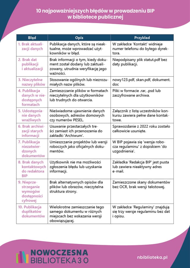 Prawidłowe prowadzenie BIP w bibliotece publicznej to nie tylko obowiązek ustawowy, ale również element budowania zaufania do instytucji publicznej. Niestety, w wielu bibliotekach błędy w Biuletynie Informacji Publicznej wynikają z niewiedzy, braku procedur lub niedopilnowania obowiązków. Tymczasem skutki mogą być poważne – od skarg obywatelskich i wezwań do uzupełnienia braków, przez naruszenia ustawy o dostępności cyfrowej, aż po ryzyko odpowiedzialności administracyjnej czy utratę wiarygodności. BIP stanowi oficjalny kanał komunikacji z obywatelami – powinien więc być przejrzysty, aktualny i zgodny z przepisami. Nawet z pozoru drobne uchybienia, takie jak brak daty publikacji dokumentu czy nieczytelne nazwy plików, mogą być interpretowane jako brak transparentności. Sprawdź 10 najpoważniejszych błędów popełnianych przez biblioteki publiczne wraz z praktycznymi przykładami. Warto je znać – i wyeliminować zanim pojawi się kontrola.