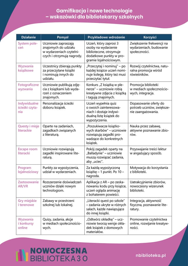 Biblioteka szkolna nie musi być miejscem cichym i statycznym – może tętnić życiem, angażować uczniów do działania i inspirować ich do sięgania po książki w nowoczesny, interaktywny sposób. W dobie cyfryzacji i kultury natychmiastowości coraz trudniej przyciągnąć uwagę młodego czytelnika tradycyjnymi metodami. Dlatego gamifikacja – czyli wykorzystanie mechanizmów znanych z gier – oraz nowe technologie (w tym aplikacje mobilne, rozszerzona rzeczywistość czy aktywności online) stają się skutecznymi narzędziami pracy bibliotekarza. Gamifikacja w bibliotece to nie tylko zabawa – to świadome budowanie relacji z uczniami, rozwijanie ich samodzielności, współpracy i kompetencji cyfrowych. Dzięki quizom, personalizowanym ścieżkom czytelniczym, konkursom online czy misjom terenowym, uczniowie mogą odkrywać literaturę w sposób, który łączy edukację z emocjami. Co ważne – nie wymaga to dużych budżetów ani zaawansowanego sprzętu. W wielu przypadkach wystarczą kartki, smartfony, kreatywność i konsekwencja.