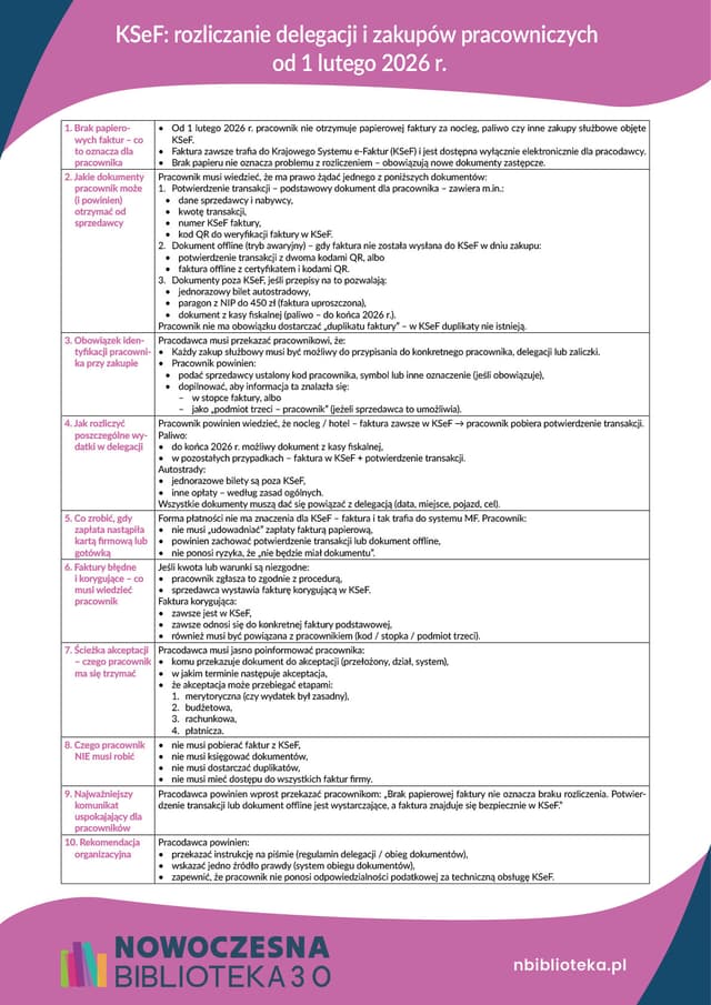 Od 1 lutego 2026 r. wraz z obowiązkowym Krajowym Systemem e-Faktur (KSeF) zmieniają się zasady rozliczania delegacji i zakupów pracowniczych – także w bibliotekach. Koniec papierowych faktur za nocleg, paliwo czy inne wydatki służbowe budzi wiele pytań i niepotrzebnych obaw wśród pracowników. Ten praktyczny przewodnik wyjaśnia, jakie dokumenty zastępują fakturę papierową, co pracownik powinien (a czego nie musi) robić przy rozliczeniu wydatków oraz jak biblioteka powinna zorganizować obieg dokumentów, aby nowe obowiązki KSeF były bezpieczne, proste i zrozumiałe dla wszystkich.