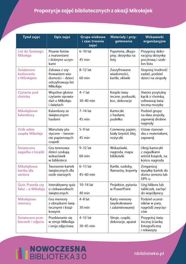 Mikołajki to doskonała okazja, by w bibliotece szkolnej, publicznej lub pedagogicznej stworzyć przestrzeń pełną świątecznej radości, czytelniczych inspiracji i twórczej zabawy. Organizując zajęcia w tym okresie, warto sięgnąć po sprawdzone pomysły, które angażują dzieci i młodzież w różnym wieku, rozwijają kompetencje czytelnicze i społeczne, a przy tym pozostają zgodne z celami edukacyjnymi i wychowawczymi biblioteki. Zajęcia mikołajkowe to nie tylko czas wspólnej zabawy, ale także pretekst do rozmów o wartościach, do rozwijania empatii i kreatywności. W artykule znajdziesz gotowe propozycje scenariuszy – od warsztatów plastycznych, przez gry terenowe i quizy, po literackie spotkania „pod choinką”. Każda propozycja zawiera szczegółowy opis aktywności, rekomendowany wiek uczestników, czas trwania, potrzebne materiały oraz praktyczne wskazówki organizacyjne. Część zajęć można zrealizować również w wersji międzyklasowej, w ramach współpracy z wychowawcami lub nauczycielami świetlicy.