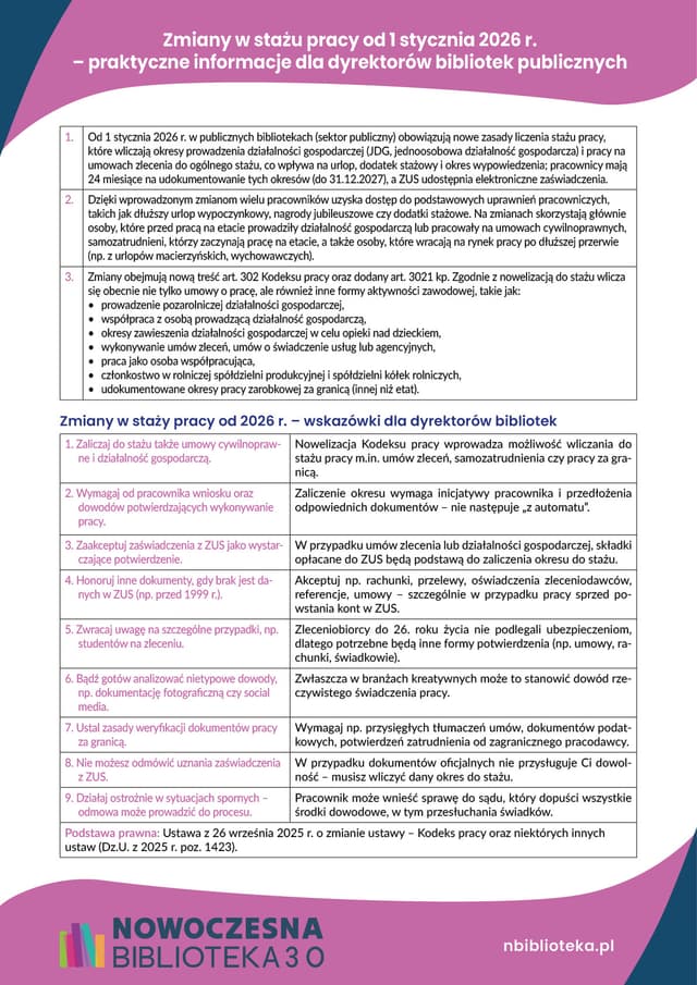 Ściąga: Zmiany w stażu pracy od 1 stycznia 2026 r. – praktyczne informacje dla dyrektorów bibliotek publicznych