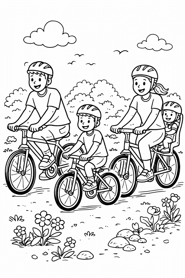 Wspólna przejażdżka w słoneczny dzień to doskonały sposób na rodzinne chwile pełne radości. Kolorowanka przedstawia aktywny wypoczynek na świeżym powietrzu i zachęca dzieci do rozmowy o sporcie, bezpieczeństwie i wspólnym spędzaniu czasu. Wyraźne kontury ułatwiają kolorowanie, a pogodna scena inspiruje do tworzenia własnych, barwnych historii. Wsiadaj na rower i pokoloruj tę rodzinną przygodę.